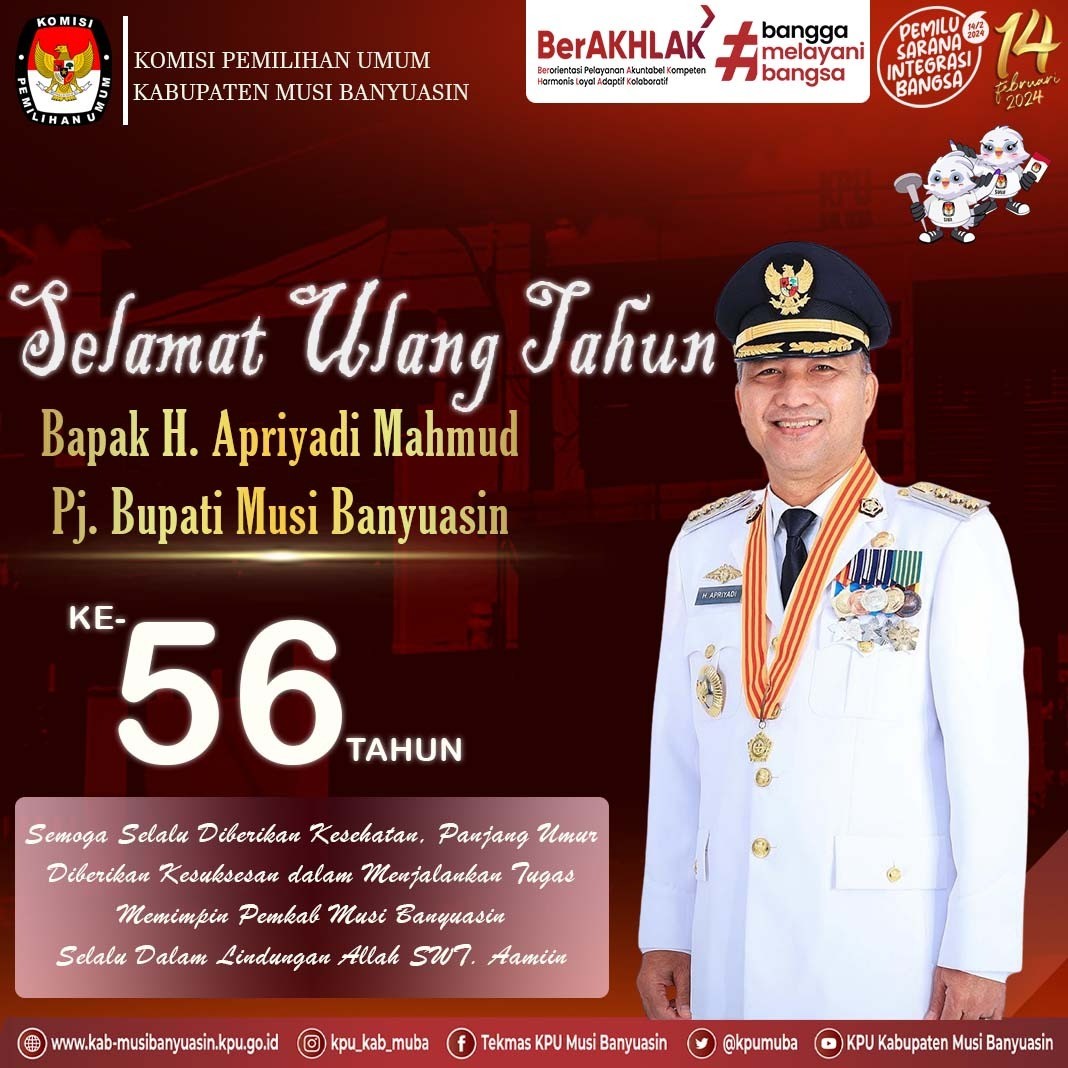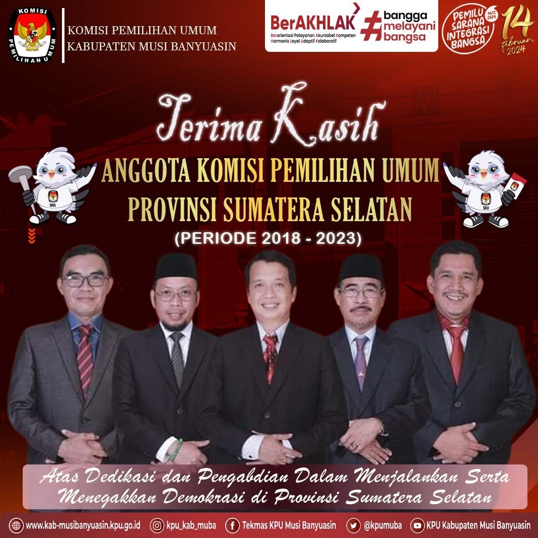 #Temanpemilih, segenap keluarga besar KPU Kabupaten Musi Banyuasin mengucapkan terima kasih yang sebesar-besarnya atas dedikasi dan pengabdiannya kepada Ketua KPU Sumsel, Bpk. Amrah Muslimin, Anggota KPU Sumsel Divisi Teknis Penyelenggaraan Pemilu, Bpk. Hendri Daya Putra, Divisi Sosdiklih Parmas dan SDM, Bpk. Hendri Almawijaya, Divisi Hukum dan Pengawasan, Bpk. Hepriyadi dan Divisi Perencanaan Data dan Informasi, Bpk. H. Hayim.