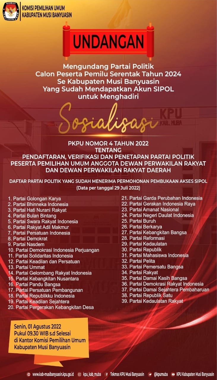 #TemanPemilih, KPU Kabupaten Musi Banyuasin mengundang Pimpinan Partai se Kabupaten Musi Banyuasin yang sudah mendapatkan akun SIPOL untuk menghadiri Sosialisasi Peraturan KPU Nomor 4 tahun 2022 tentang Pendaftaran, Verifikasi dan Penetapan Partai Politik Peserta Pemilu Anggota DPR dan DPRD.
