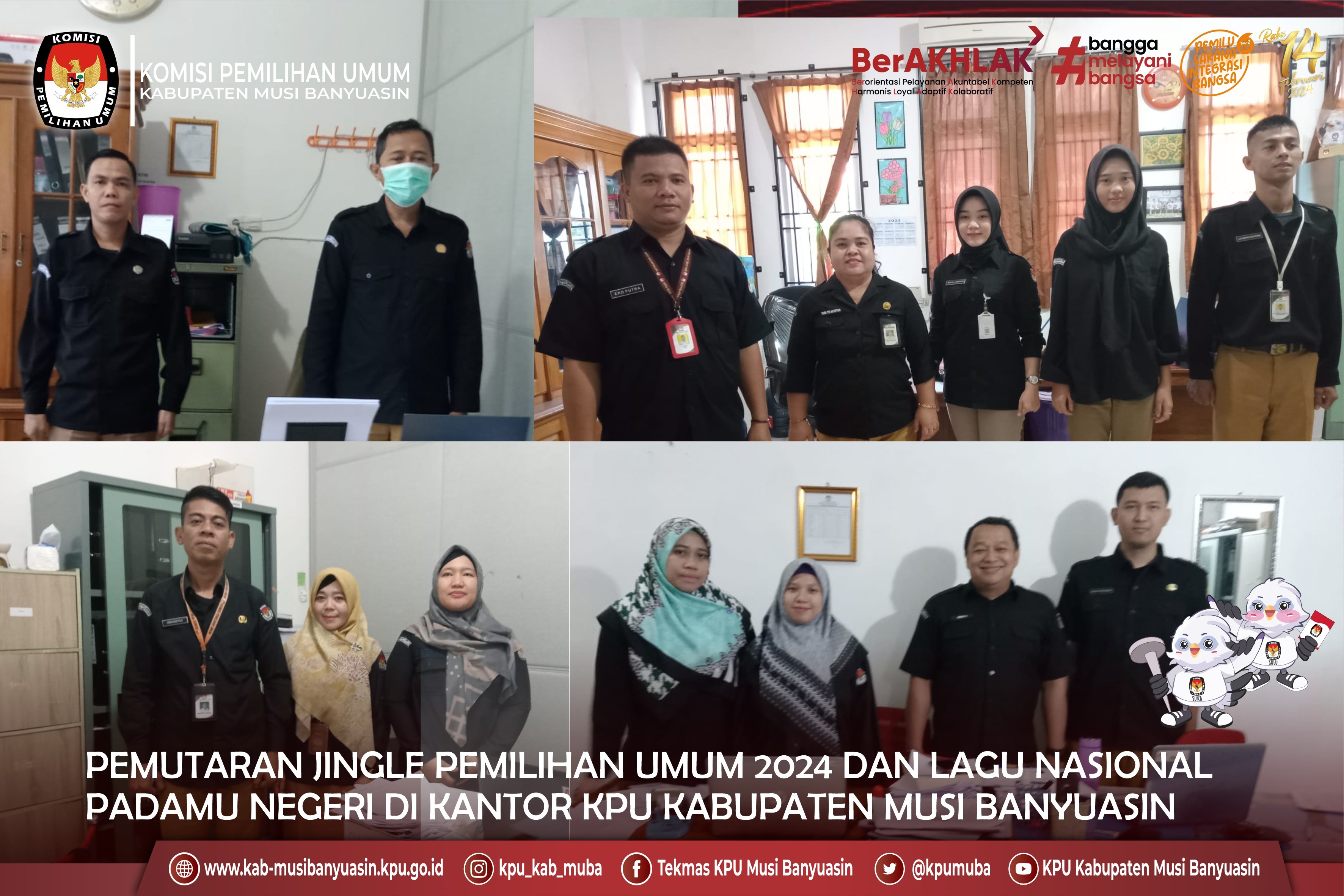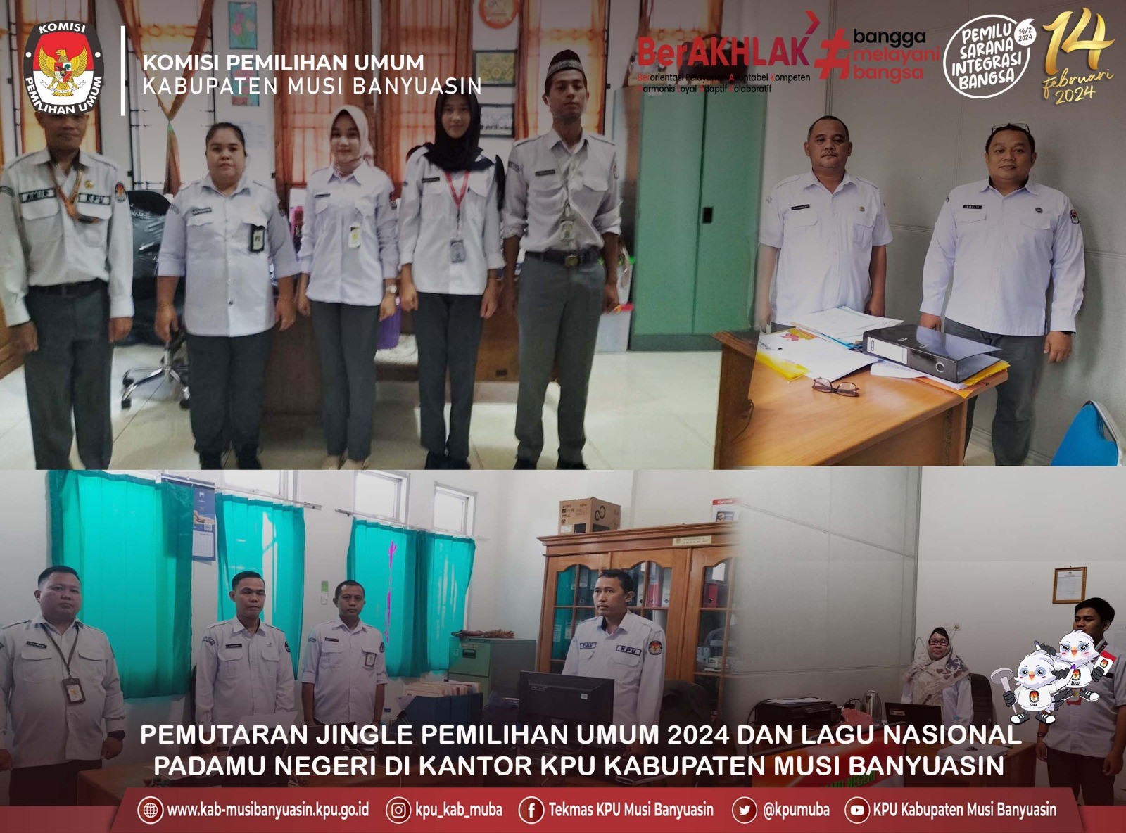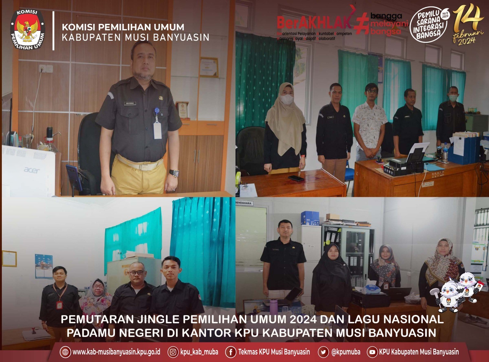 #TemanPemilih. KPU Kab. Musi Banyuasin Melaksanakan Pemutaran Lagu Jingle Pemilu 2024 dan Lagu Nasional Padamu Negeri. Pemutaran lagu ini sesuai dengan Surat Edaran Nomor 8 Tahun 2023 tentang Pemutaran Jingle Pemilu 2024 dan Lagu Nasional Padamu Negeri, Selasa (14/11/2023). Pemutaran lagu ini menjadi Rutunitas KPU Kab. Musi Banyuasin yang dilaksanakan setiap hari Senin sampai dengan Jumat dan dilakukan sebanyak 2 kali pemutaran. Pemutaran ke-1 pada Pukul 10.00 Wib dan Pemutaran ke-2 pada Pukul 15.00 Wib. Pemutaran Lagu Padamu Negeri diharapkan dapat meningkatkan rasa cinta kebangsaan dan tanah air dan pemutaran lagu Jingle Pemilu untuk mendukung kegiatan Sosialisasi tahapan pemilu tahun 2024, sebagai komitmen untuk melayani masyarakat menggunakan hak pilihnya serta meningkatkan partisipasi masyarakat. #KPUMelayani #PemiluSerentak2024 ------------------------------------ Find Us On: Facebook: Tekmas KPU Musi Banyuasin Instagram: kpu_kab_muba Youtube: KPU Kabupaten Musi Banyuasin Twitter: @kpumuba Website: www.kab-musibanyuasin.kpu.go.id Alamat: Jl. Sekayu - Muara Teladan RT. 035 RW. 010 Kelurahan Balai Agung Kec. Sekayu - Musi Banyuasin.