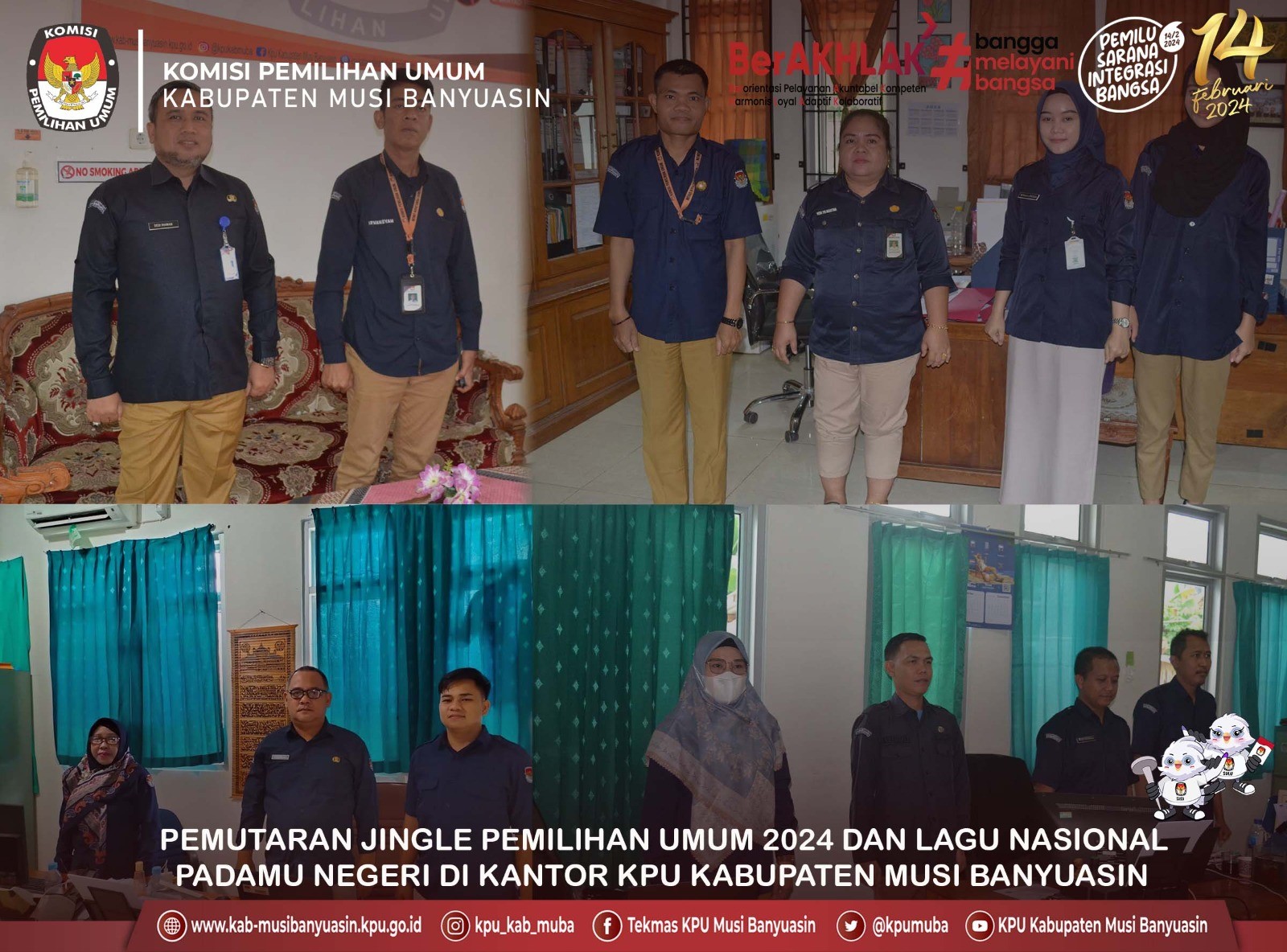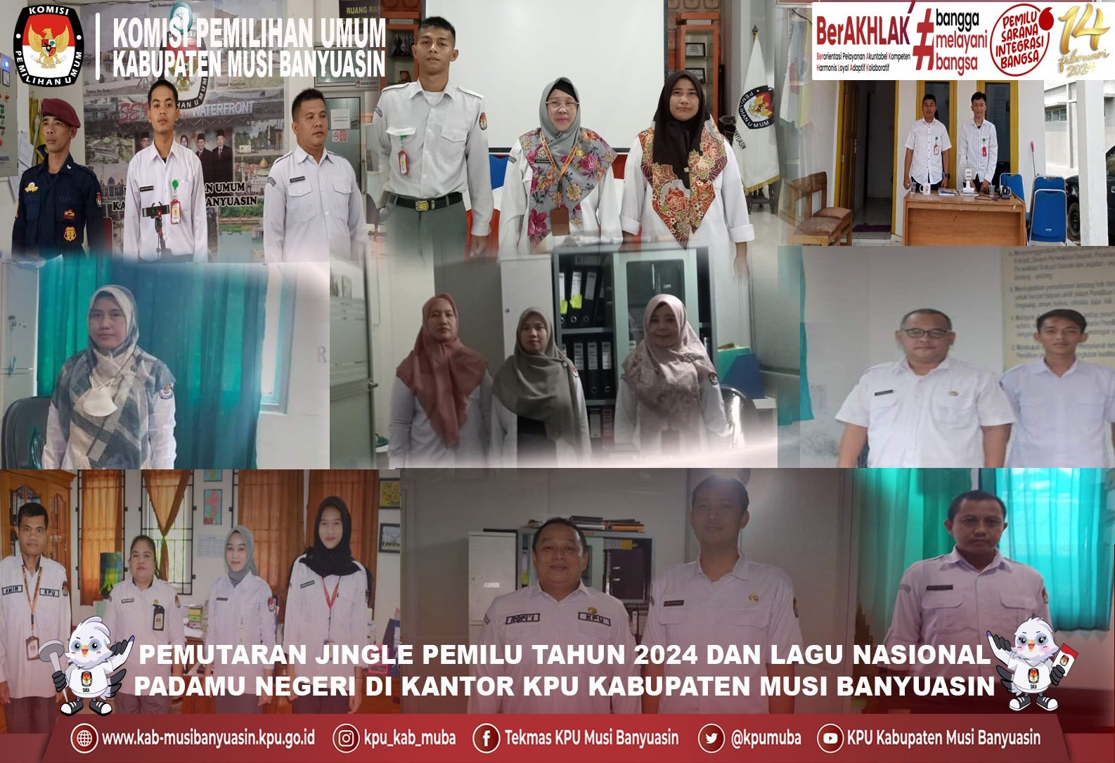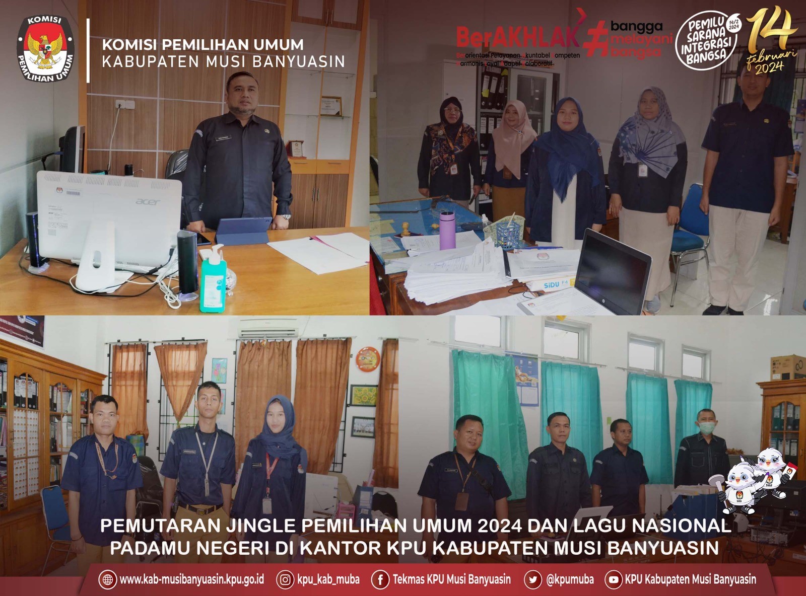 #TemanPemilih. KPU Kab. Musi Banyuasin Melaksanakan Pemutaran Lagu Jingle Pemilu 2024 dan Lagu Nasional Padamu Negeri. Pemutaran lagu ini sesuai dengan Surat Edaran Nomor 8 Tahun 2023 tentang Pemutaran Jingle Pemilu 2024 dan Lagu Nasional Padamu Negeri, Selasa (14/11/2023). Pemutaran lagu ini menjadi Rutunitas KPU Kab. Musi Banyuasin yang dilaksanakan setiap hari Senin sampai dengan Jumat dan dilakukan sebanyak 2 kali pemutaran. Pemutaran ke-1 pada Pukul 10.00 Wib dan Pemutaran ke-2 pada Pukul 15.00 Wib. Pemutaran Lagu Padamu Negeri diharapkan dapat meningkatkan rasa cinta kebangsaan dan tanah air dan pemutaran lagu Jingle Pemilu untuk mendukung kegiatan Sosialisasi tahapan pemilu tahun 2024, sebagai komitmen untuk melayani masyarakat menggunakan hak pilihnya serta meningkatkan partisipasi masyarakat. #KPUMelayani #PemiluSerentak2024 ------------------------------------ Find Us On: Facebook: Tekmas KPU Musi Banyuasin Instagram: kpu_kab_muba Youtube: KPU Kabupaten Musi Banyuasin Twitter: @kpumuba Website: www.kab-musibanyuasin.kpu.go.id Alamat: Jl. Sekayu - Muara Teladan RT. 035 RW. 010 Kelurahan Balai Agung Kec. Sekayu - Musi Banyuasin.