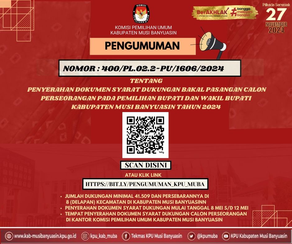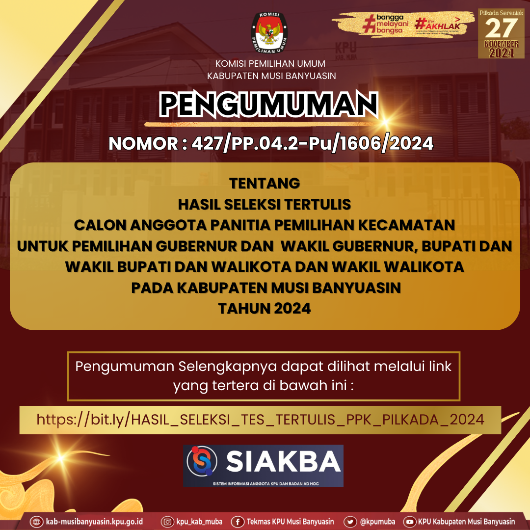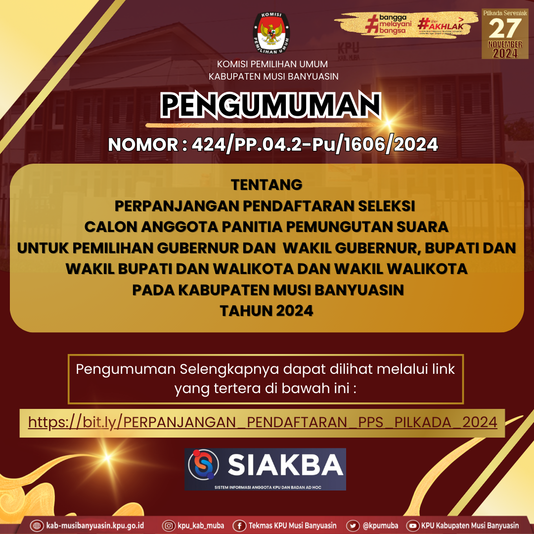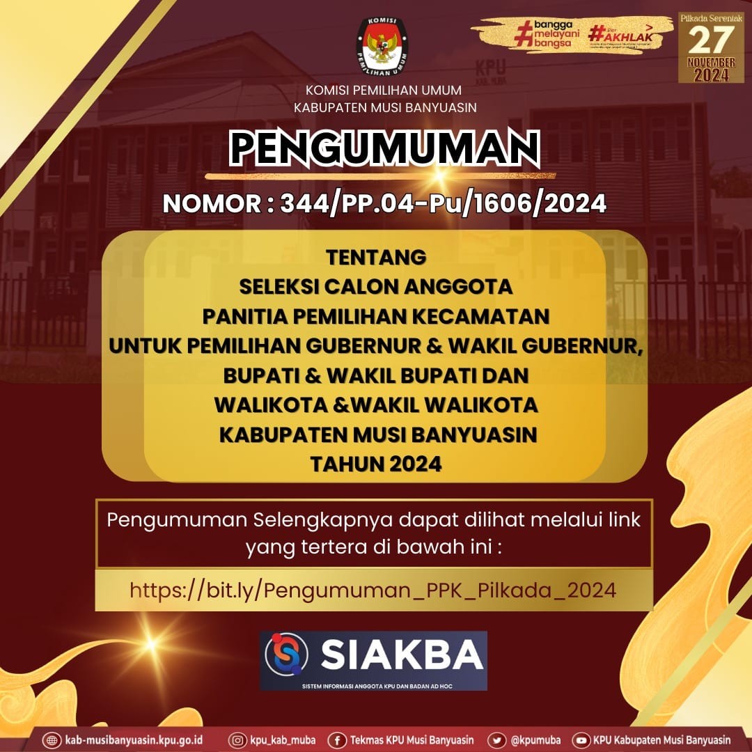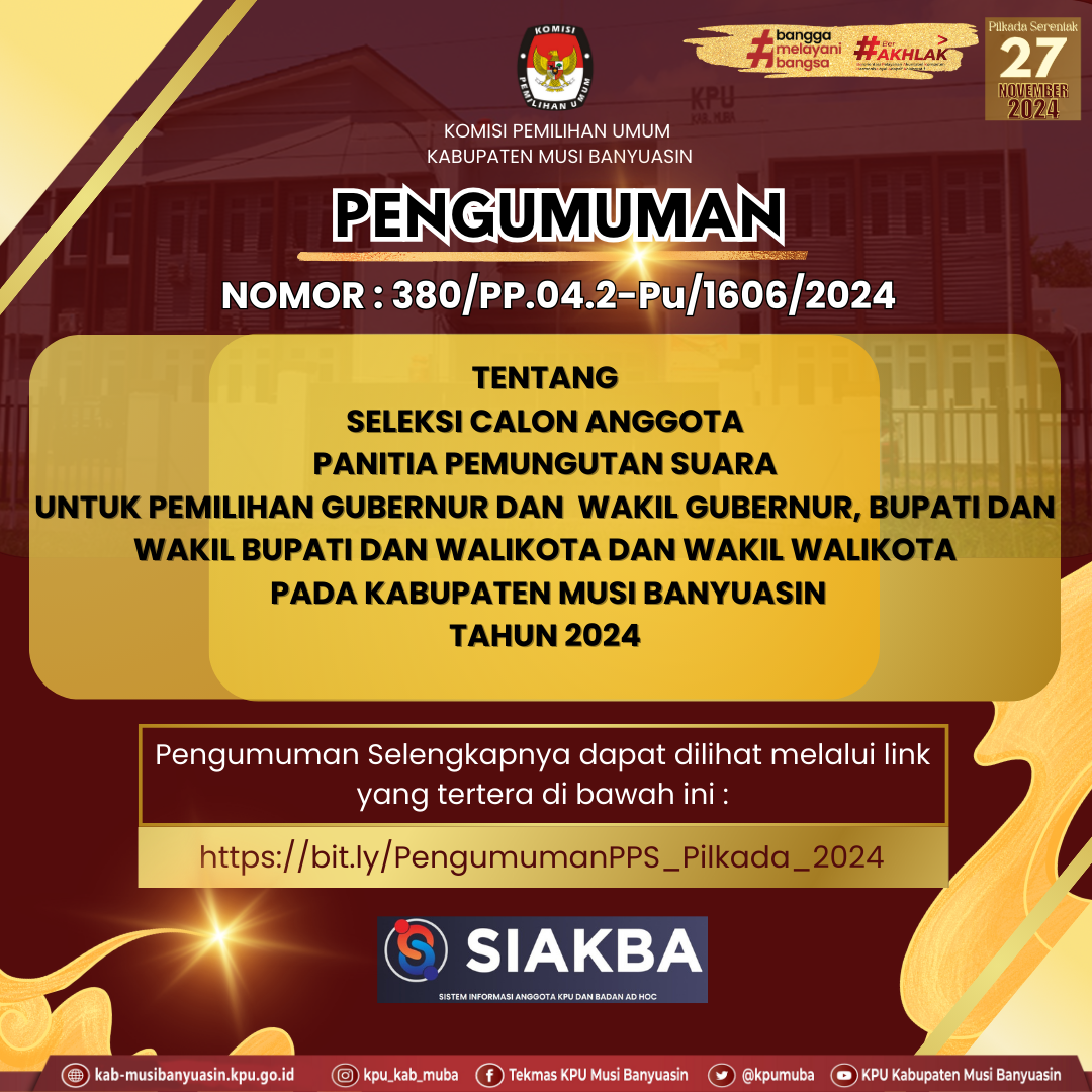 #Haitemanpemilih, Kamis 2 mei 2024 berikut Pengumuman Nomor 380/PP.04-Pu/ 1606/2024 tentang Seleksi Calon Anggota Panitia Pemungutan Suara (PPS) untuk Pemilihan Gubernur dan Wakil Gubernur, Bupati dan Wakil Bupati dan Walikota dan Wakil Walikota Pada Kabupaten Musi Banyuasin Tahun 2024.