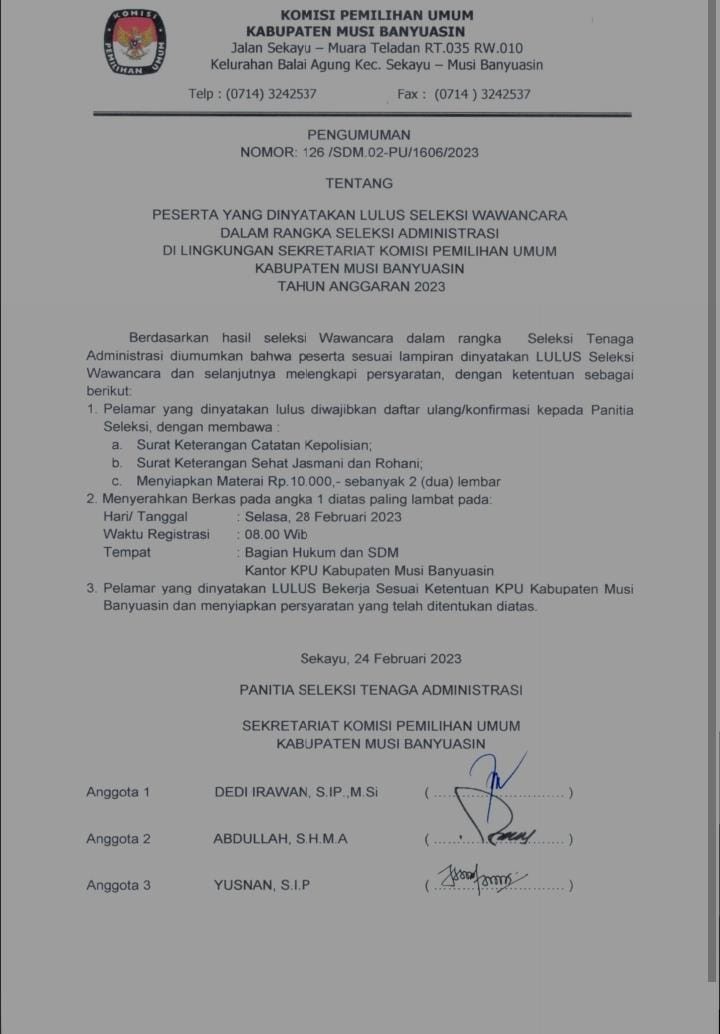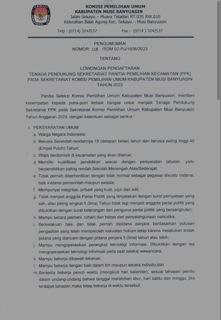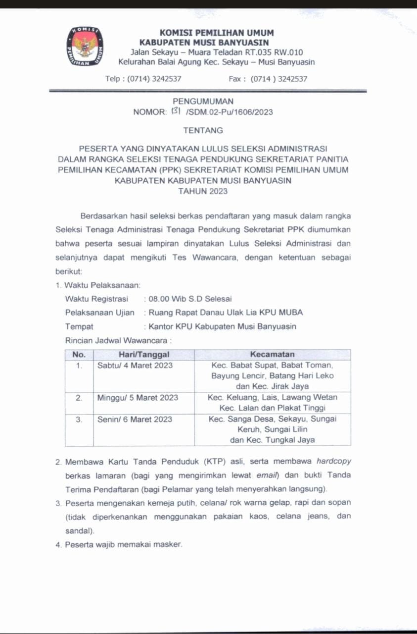 #TemanPemiih, Senin, 24 April 2023 Berikut Pengumuman Nomor : 295/PL.01.4-PU/1606/2023 Tentang Pengajuan Bakal Calon Anggota DPRD Kabupaten Musi Banyuasin Untuk Pemilu Serentak Tahun 2024 atau bisa klik link berikut :
