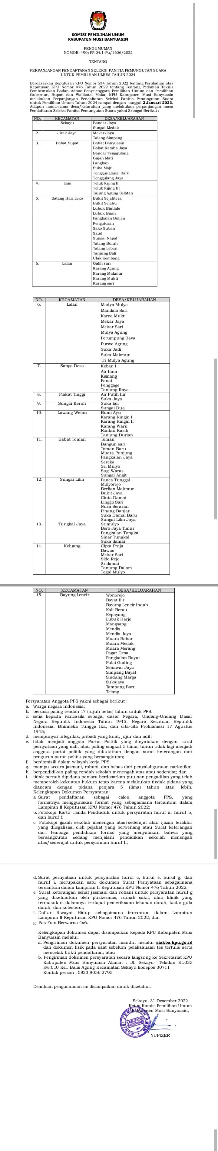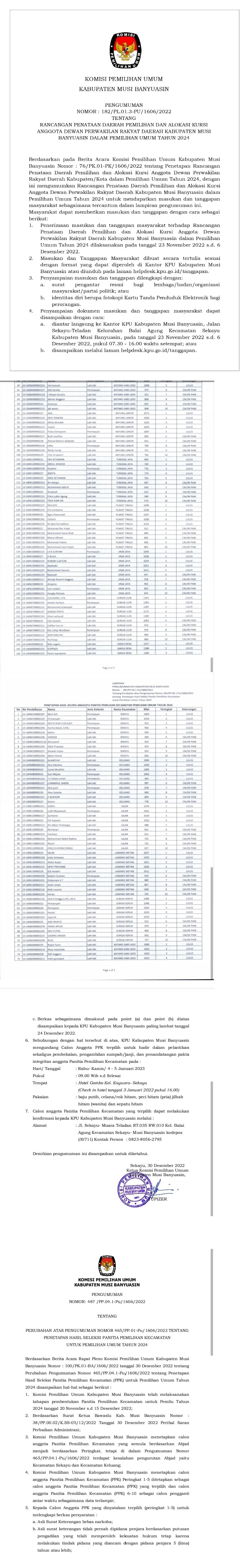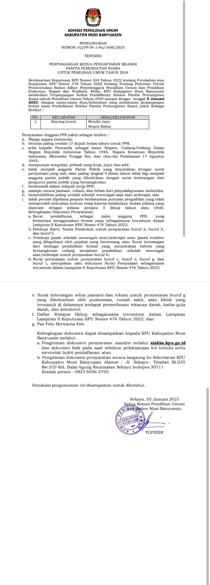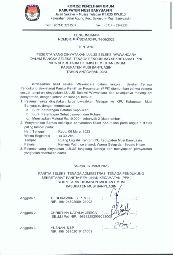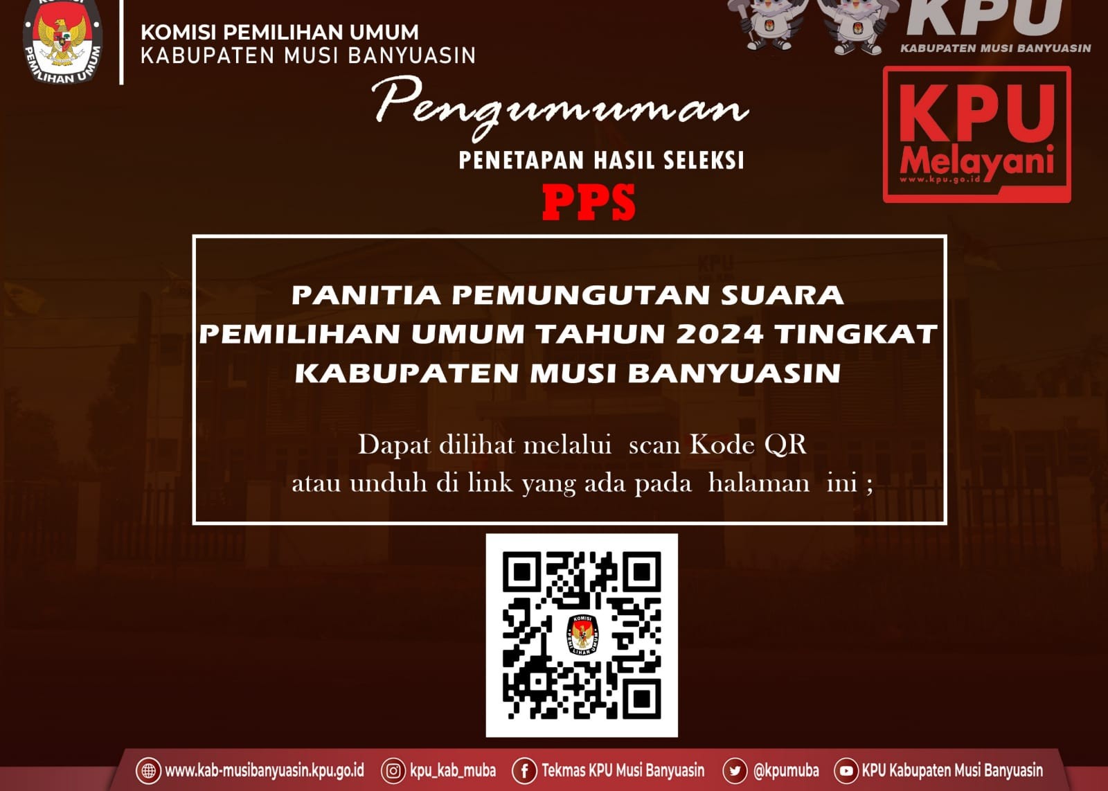 Berikut Pengumuman Nomor: 57/PP.04.1-PU/1606/2023 Tentang Hasil Seleksi Tes Tertulis Panitia Pemungutan Suara (PPS) untuk Pemilihan Umum Tahun 2024.